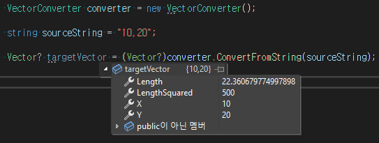 VectorConverter 클래스의 ConvertFromString 메소드를 사용하면 문자열을 Vector 객체로 변경할 수 있습니다.