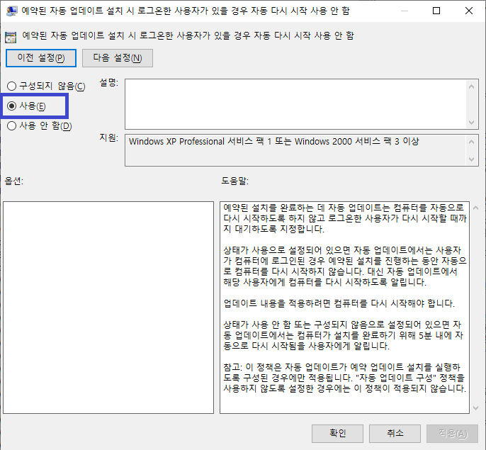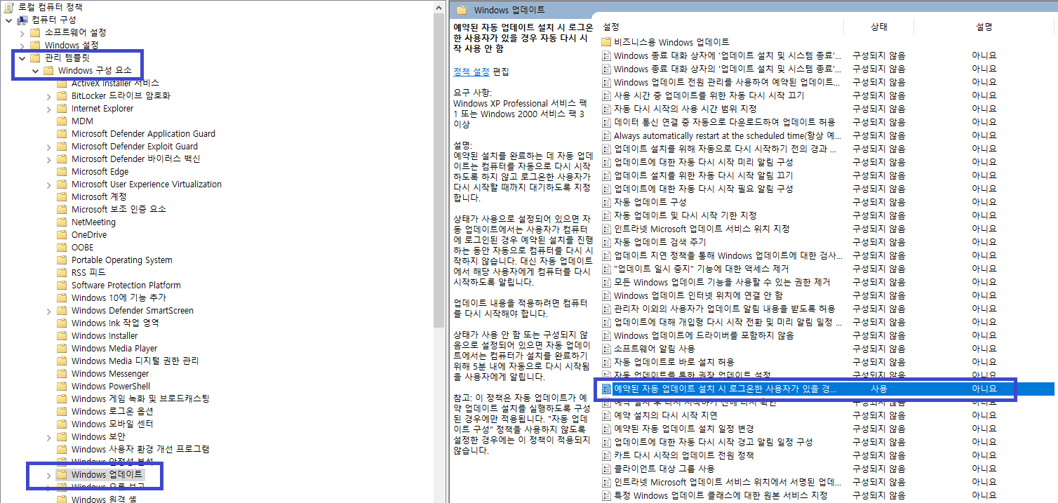 2. 컴퓨터 구성 > 관리 템플릿 > Windows 구성 요소 > 예약된 자동 업데이트 설치 시 로그온한 사용자가 있을 경우 자동 다시 시작 사용 안 함 항목을 더블 클릭하여 실행하여 사용으로 변경