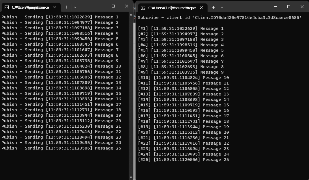 아래는 클라이언트(Pub)에서 메세지를 전달하고 서버(Sub)에서는 전달한 메세지를 받는 예제입니다.