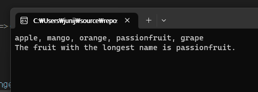 Console.WriteLine("The fruit with the longest name is {0}.", longestName);