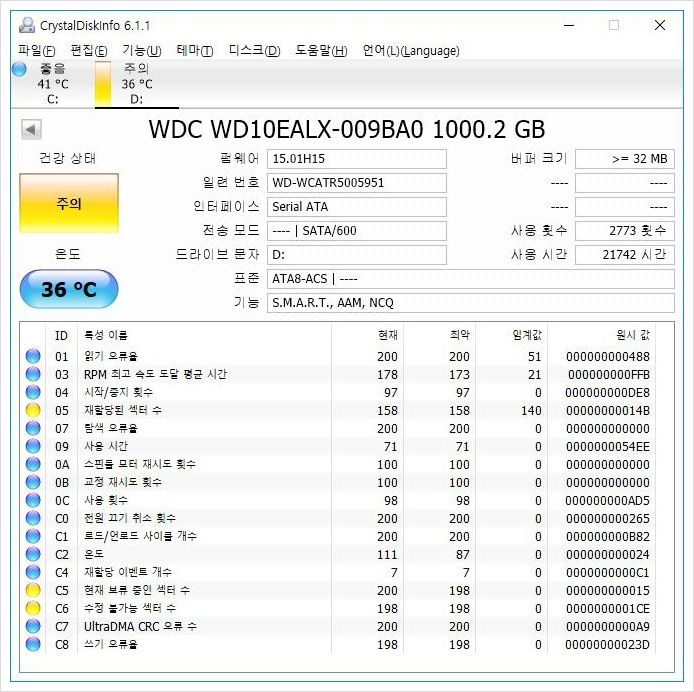 중고로 업어온 HDD 가 아래 처럼 주의로 표시가 되었다.