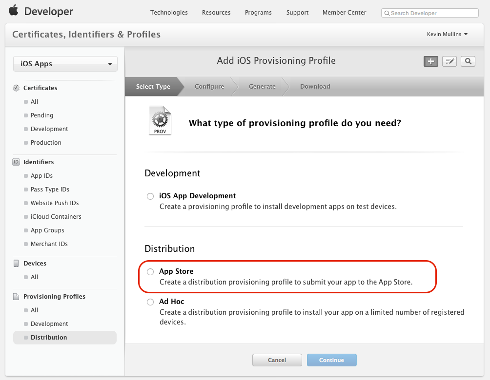 - + 단추를 클릭하고 App Store 만들 배포 프로필 유형을 선택합니다.