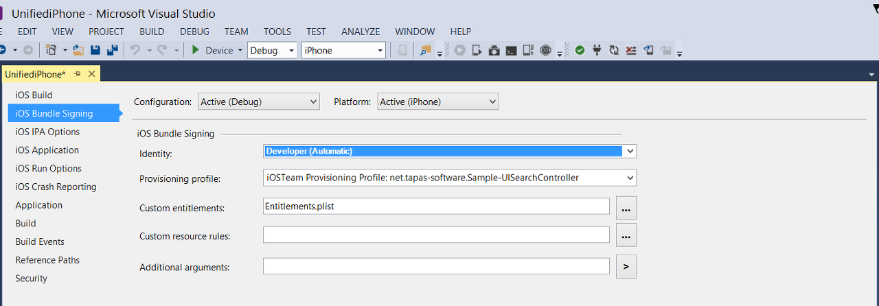 - 대부분의 경우 서명 ID 및 프로비전 프로필은 기본값(자동)으로 그대로 둘 수 있으며, Visual Studio에서는 Info.plist의 번들 식별자에 따라 올바른 프로필을 선택합니다.