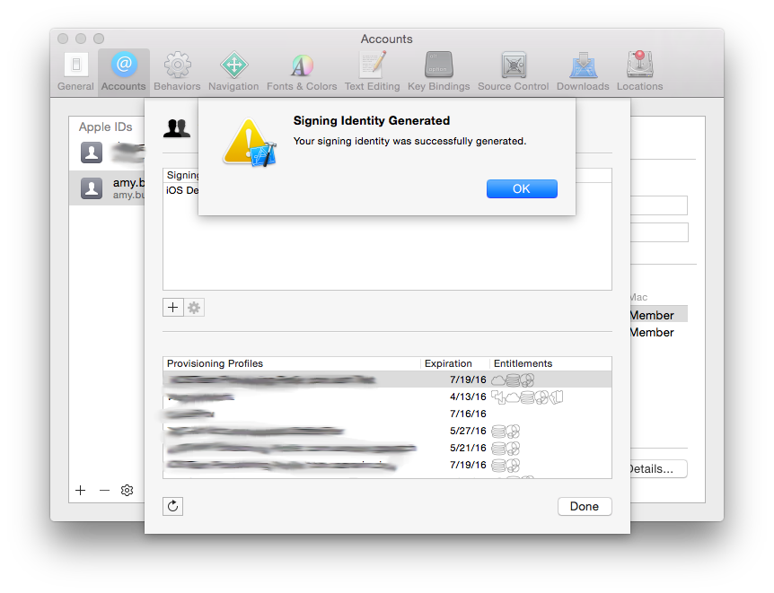Visual Studio에서 새 배포 프로필을 사용하려면, 먼저 Visual Studio를 종료한 다음, 서명 ID 요청 섹션의 지침에 따라 빌드 호스트의 Mac에 있는 Xcode에서 사용 가능한 서명 ID 및 프로비전 프로필의 목록을 새로 고쳐야 할 수도 있습니다.